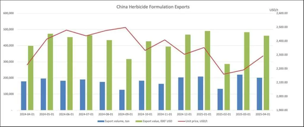For the first four months of 2025, China exported 763,161 tons of herbicide formulations, with an accumulated export value of US $1.72 billion. The average price for this period stood at US $2,248.93 per ton.